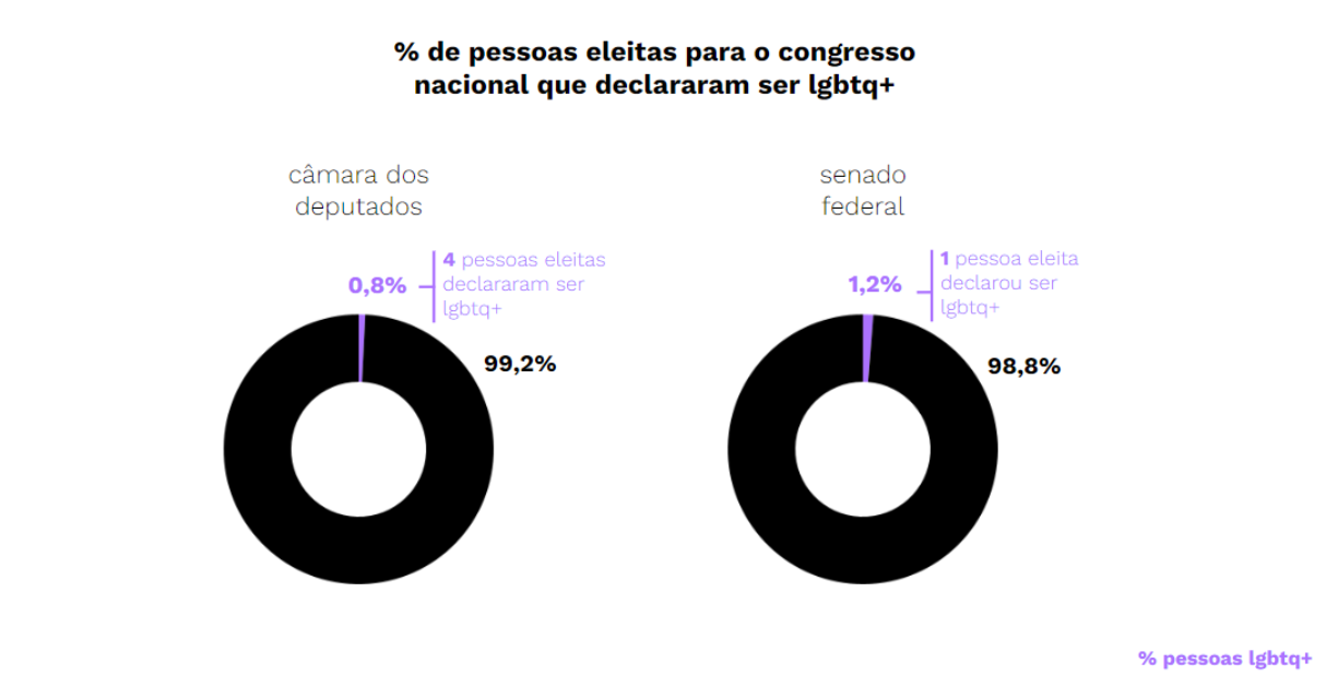 Não há dados oficiais sobre a representatividade da população LGBTQIA+ na Justiça Eleitoral ou no banco de dados disponibilizado pelo Congresso Nacional. Isso já é um primeiro indicativo sobre a invisibilidade e sub-representação dessa população na Câmara e no Senado.