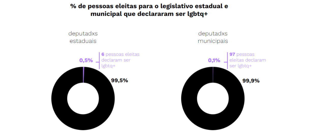 De acordo com levantamentos realizados por entidades e coletivos [1] que se dedicam ao tema, em 2018, nas eleições para o Congresso Nacional, houve um aumento de 386,4% de candidaturas LGBTQIA+, mesmo assim, apenas 0,8% de deputados federais eleitos são LGBTQIA+, e só 1 senador. E, em 2020, nas eleições para os legislativos municipais, as Câmaras Municipais de todo o Brasil elegeram 97 pessoas LGBTQIA+, sendo 20 pessoas trans.