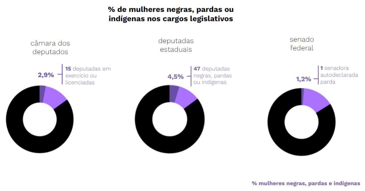 A população brasileira é composta, em sua maioria, por mulheres (51,8% do total), sendo 23,5% de mulheres pretas, pardas e indígenas. No entanto, o Congresso Nacional não expressa essa proporção da sociedade. Mesmo sabendo que, nas eleições de 2018, o número de mulheres eleitas dobrou, ainda é muito baixa a representação no Congresso Nacional, com apenas 12,5% de mulheres. O Senado Federal e a Assembleia Legislativa seguem a mesma lógica de exclusão e baixa representatividade.
