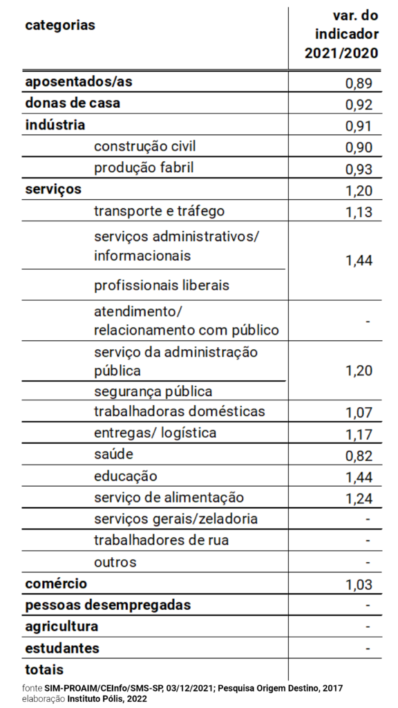 [10] Apesar de serem grupos com atividades diversas, pela metodologia utilizada na construção do indicador, são avaliados em conjunto. A quantidade de pessoas no município de São Paulo e o indicador foram calculados a partir da variável ‘Setor de Atividade’, disponível na Pesquisa Origem e Destino 2017. A definição do Setor de Atividade, no entanto, é mais abrangente do que a classificação das ocupações realizada por este estudo. A escolha metodológica de segmentar alguns setores foi feita para analisar o impacto dos óbitos de alguns grupos, que compõem o mesmo setor, porém possuem características bastante diferentes, tais como: tipo de atuação, nível de exposição, distribuição etária, racial, escolaridade, padrões territoriais, etc. Portanto, o indicador pode abranger mais de um grupo analisado pela pesquisa.
