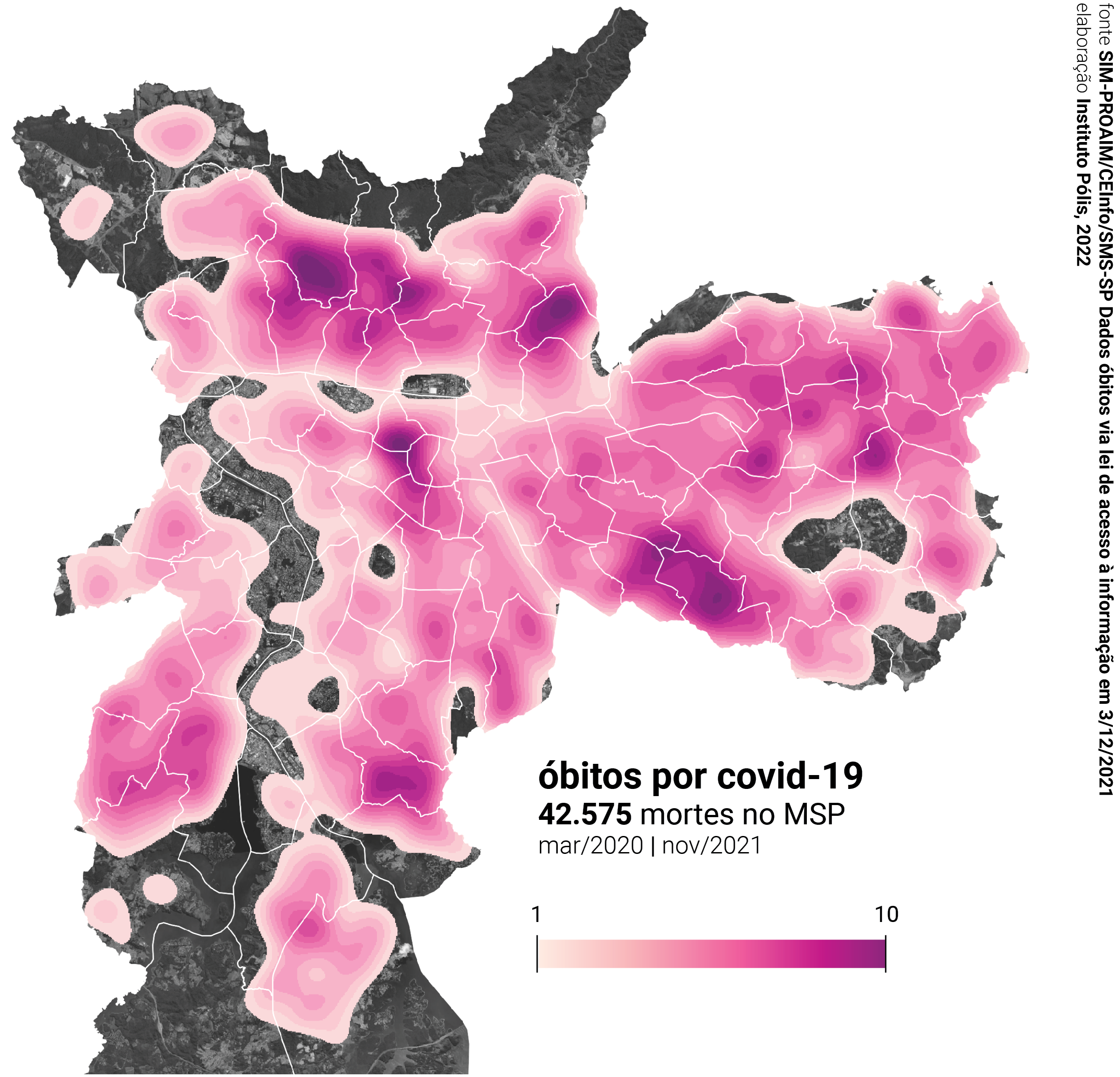 Para demonstrar e entender os efeitos desiguais da pandemia, utilizamos alguns recursos de análise baseados em dados públicos da Secretaria Municipal de Saúde de São Paulo (SMS). [1] As informações gerais sobre mortalidade por Covid-19 foram obtidas na plataforma DataSUS/Tabnet no dia 03 de fevereiro de 2022 e, portanto, já contêm números referentes ao primeiro mês do ano. As informações mais detalhadas, contendo setor censitário de residência, estabelecimento de saúde e ocupação da vítima foram obtidas via Lei de Acesso à Informação em 3 de dezembro de 2021, incluindo dados até o mês de novembro do mesmo ano. [2] Os dados sobre vacinação foram obtidos na plataforma de dados abertos Open Datasus, do Ministério da Saúde.