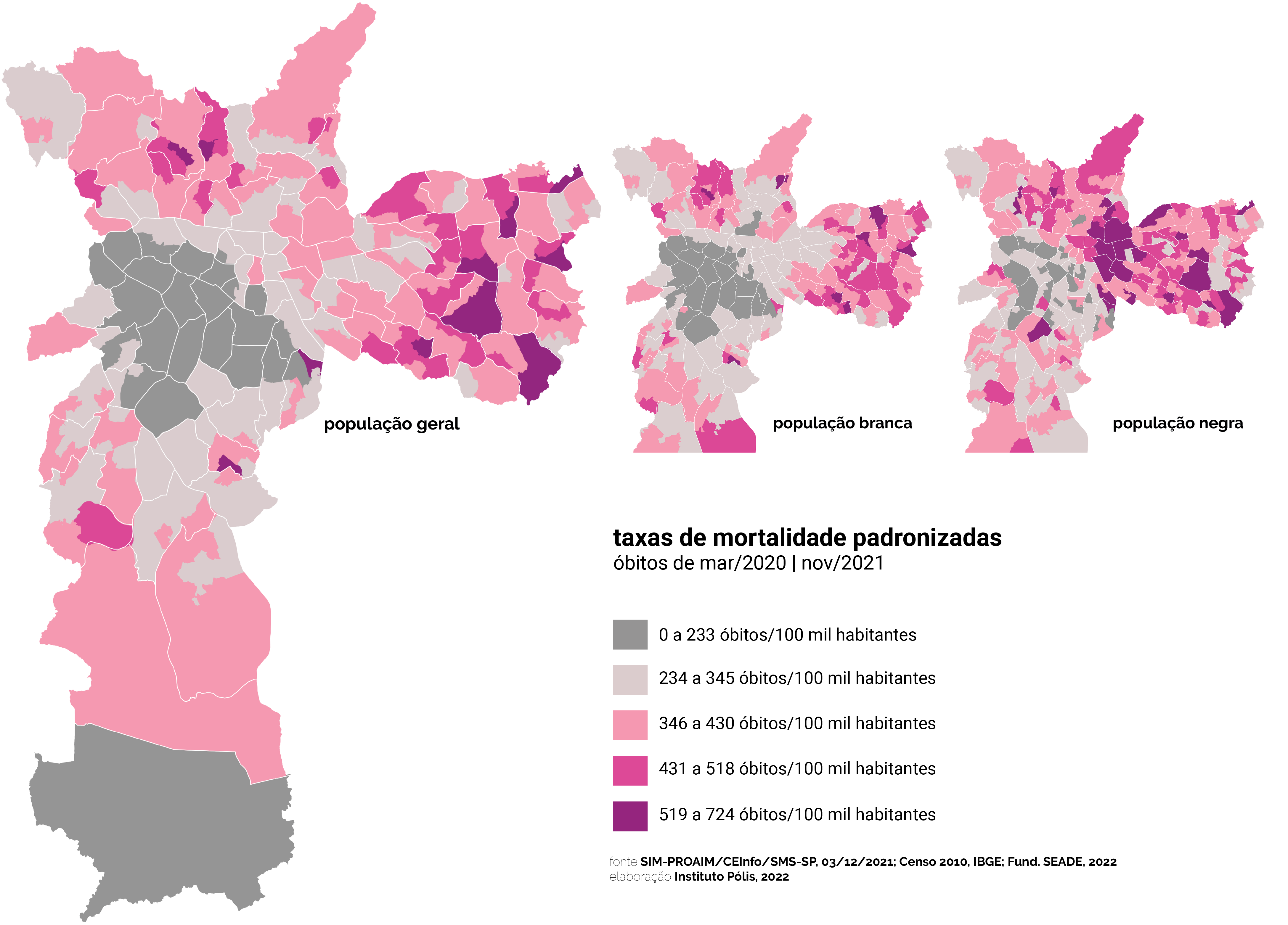A iniquidades raciais observadas desde o início da pandemia se mantiveram ao longo de todo o período analisado. Se as taxas de mortalidade mostram que, comparativamente, morrem mais negros do que brancos, é fundamental entender como as condições gerais de vida (renda, trabalho, moradia, mobilidade) e de acesso à saúde interferem nos riscos de infecção e no desenvolvimento da doença com maior gravidade – incluindo casos que terminam em óbito. Idealmente, as ações de combate a pandemia deveriam se propor encarar as desigualdades e o racismo estrutural buscando a redução das mortes até que não houvesse diferenças tão significativas entre aquelas observadas nas taxas de mortalidade. O mapeamento deste indicador ajuda a entender onde vivem as populações mais impactadas pelas mortes da pandemia.
