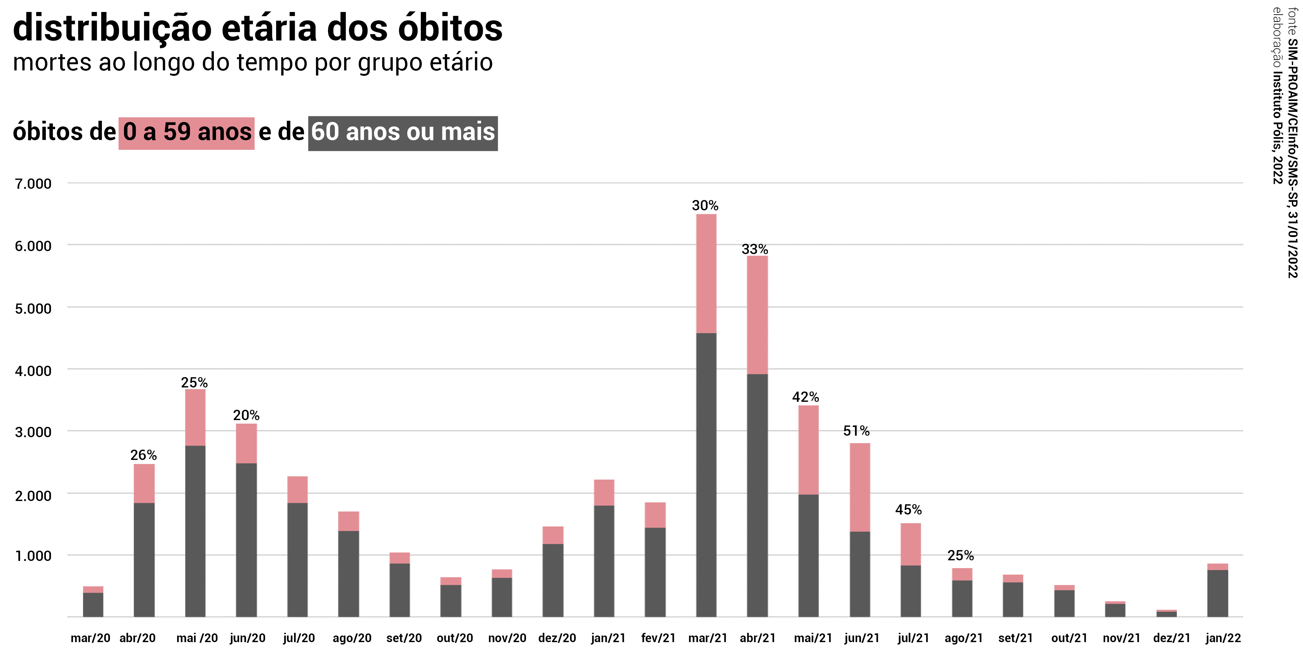 O primeiro mês de 2022 já registrou 864 óbitos por Covid-19; número sete vezes maior ao de dezembro de 2021. Deste total, 752 são de pessoas com 60 anos ou mais. O aumento expressivo é consequência da circulação da variante Ômicron (mais infecciosa), mas também de um relaxamento geral da população e das autoridades, que deixaram de implementar medidas necessárias ao controle epidemiológico, como vigilância ativa, testagem, busca ativa de contatos, etc.