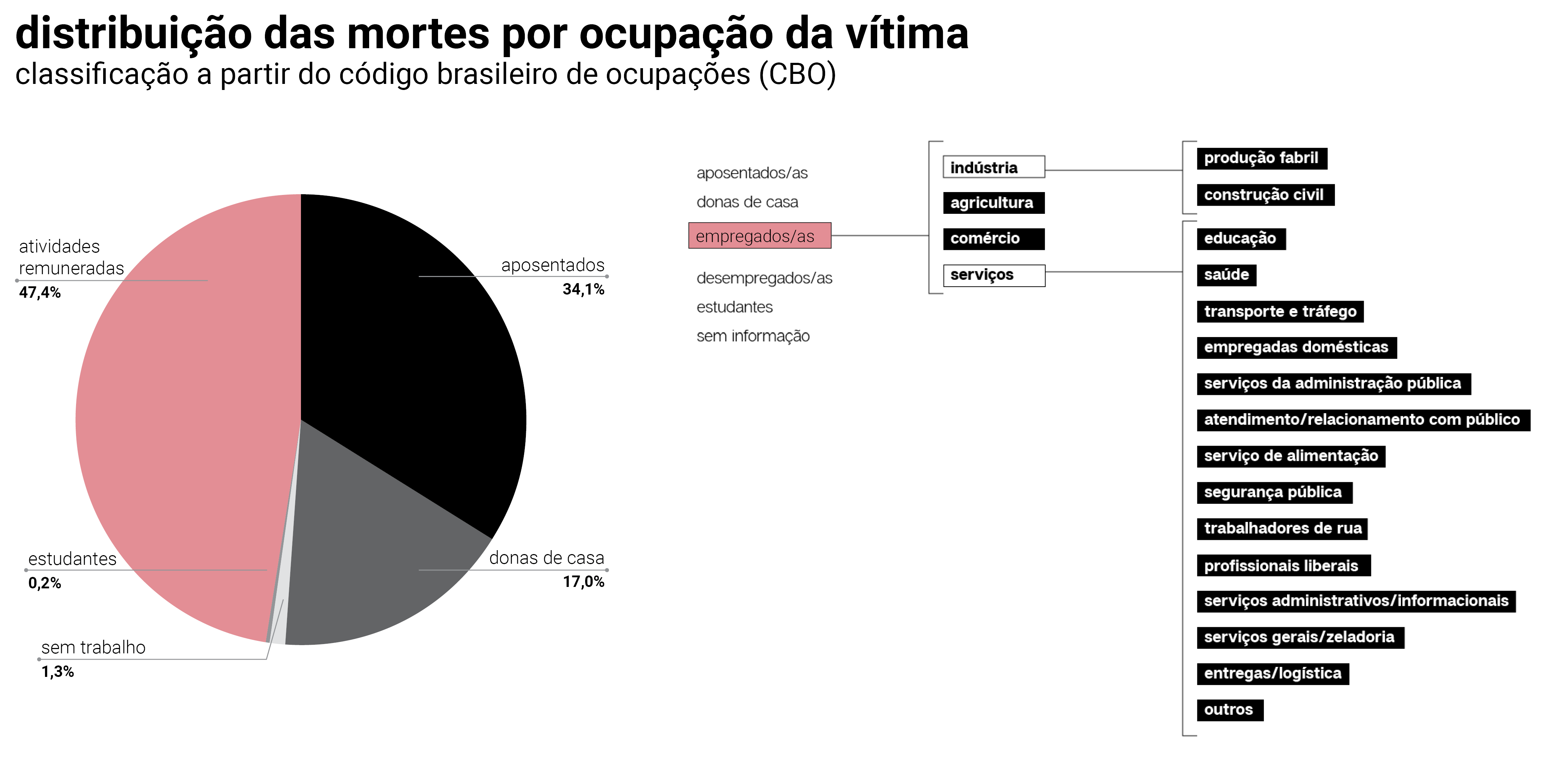O menor padrão de renda pode também expressar a colocação no mercado de trabalho de determinadas populações. As possibilidades de isolamento/distanciamento social, assim como a adoção de outras medidas não farmacológicas de proteção, são desiguais entre diferentes grupos sociais, na medida em que muitas famílias não podem deixar de trabalhar presencialmente durante a pandemia, implicando uma maior exposição à infecção ao circular pela cidade. Os deslocamentos em função do trabalho são um fator preponderante ao grau de disseminação do vírus conforme estudos anteriores demonstraram. Neste sentido, é fundamental avaliar a ocupação das vítimas de Covid-19 para inferir a relação da retomada de determinadas atividades econômicas – em seu exercício presencial – com a disseminação do vírus e a mortalidade da pandemia.