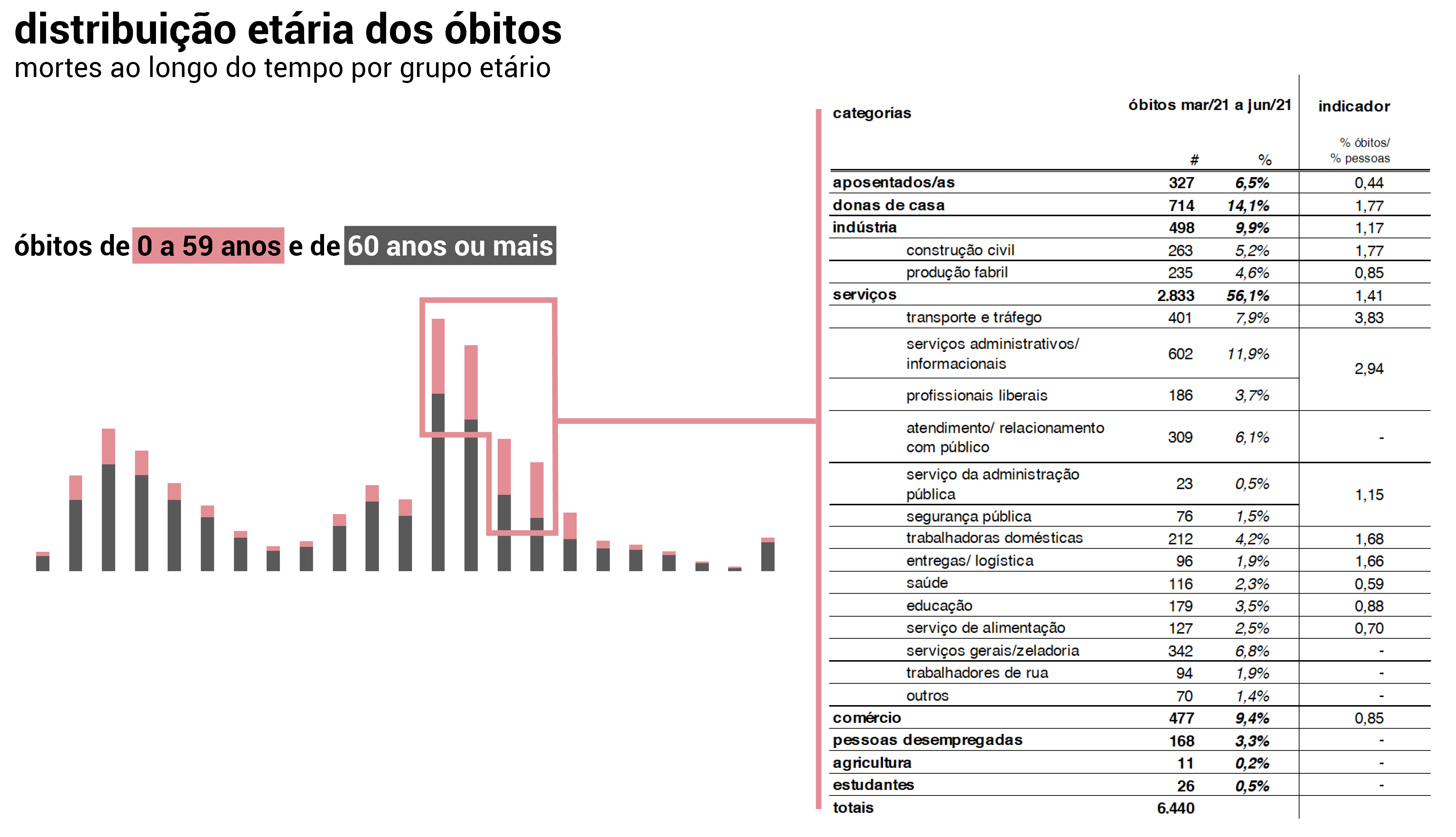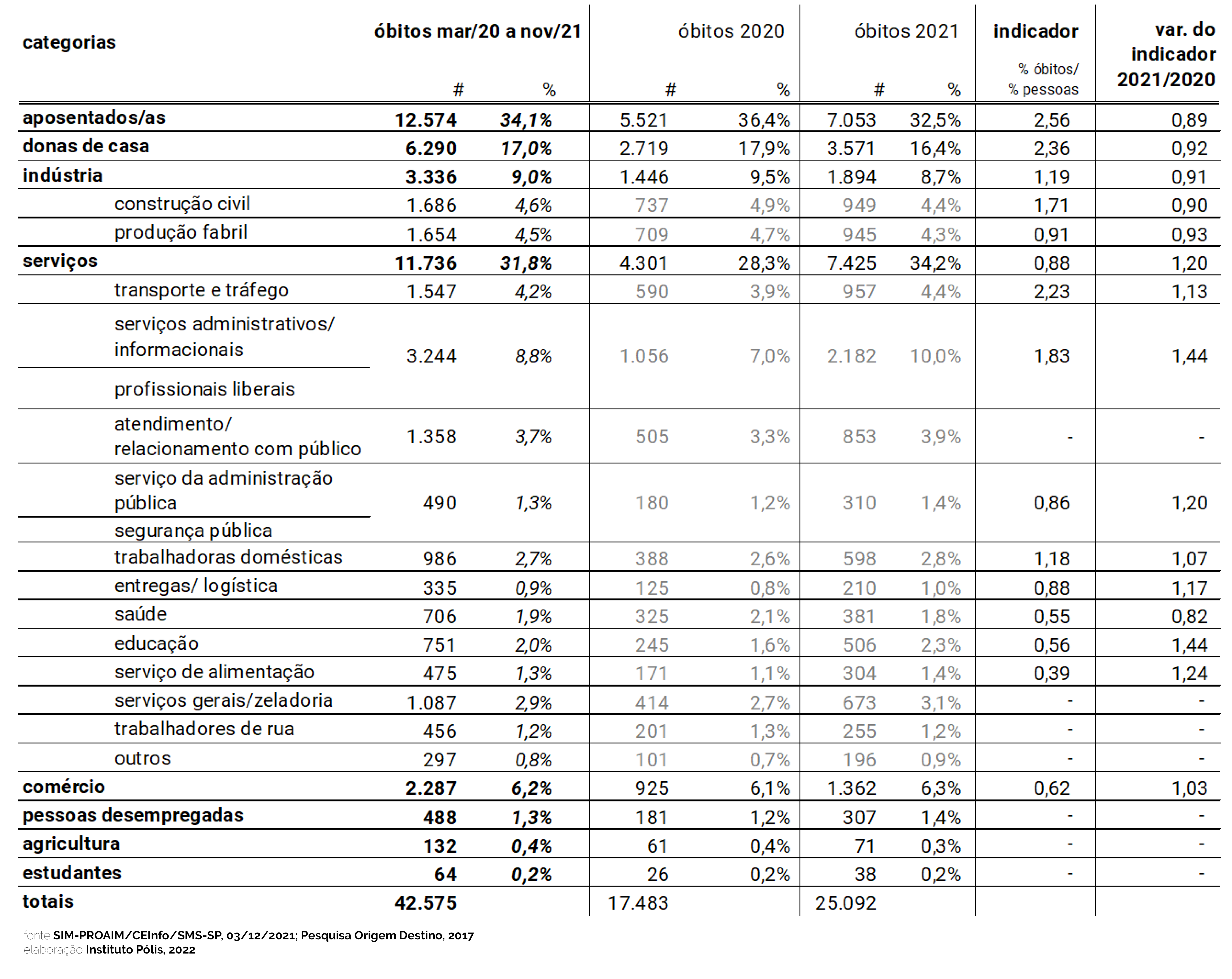Como leitura geral, verificamos que a mortalidade está concentrada em categorias em que predominam grupos de risco, como é o caso de aposentados e donas de casa, que concentram pessoas idosas. Quanto às atividades remuneradas, as mais impactadas são aquelas – em sua maioria – de menor rendimento, em que os trabalhadores e trabalhadoras, penalizados pela falta de seguridade social e políticas adequadas de amparo social, foram continuamente obrigados a sair para trabalhar durante a pandemia (sem proteção adequada) para não comprometer os rendimentos familiares.