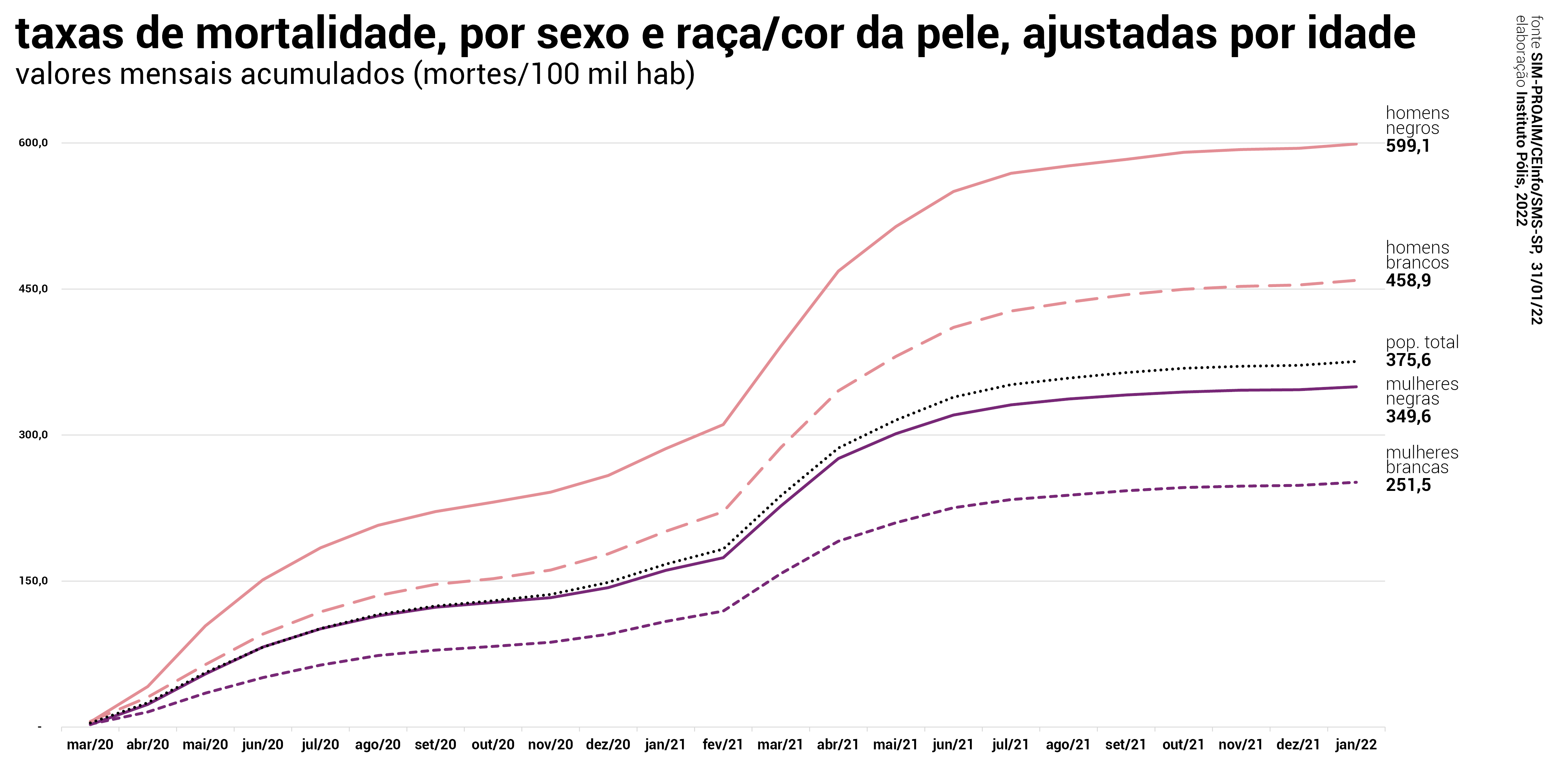 O cálculo das taxas de mortalidade [4] ao longo dos meses indica um impacto desigual sobre os grupos populacionais definidos por raça/cor da pele e sexo. [5] A mortalidade entre pessoas negras (pretas e pardas) tem sido significativamente maior do que em pessoas brancas. Nos momentos em que a pandemia se agravou, acelerando os óbitos, o impacto da mortalidade foi proporcionalmente maior entre mulheres negras e, principalmente, entre homens negros. Sempre que há um aumento expressivo no número de mortes, a curva da mortalidade de homens negros tende a se distanciar das demais, apresentando taxas muito maiores. Na primeira onda (entre maio e junho de 2020), a taxa de mortalidade de homens negros foi de 62,7 mortes acada 100 mil habitantes, duas vezes maior que a taxa de mortalidade geral do MSP, de 30,9 mortes/100 mil habitantes. Durante a segunda onda (março e abril de 2021), o aumento mais expressivo é novamente observado na taxa de mortalidade de homens negros, confirmando um padrão racial: quando a pandemia piora (com aumento de mortes), o impacto é maior entre pretos e pardos.