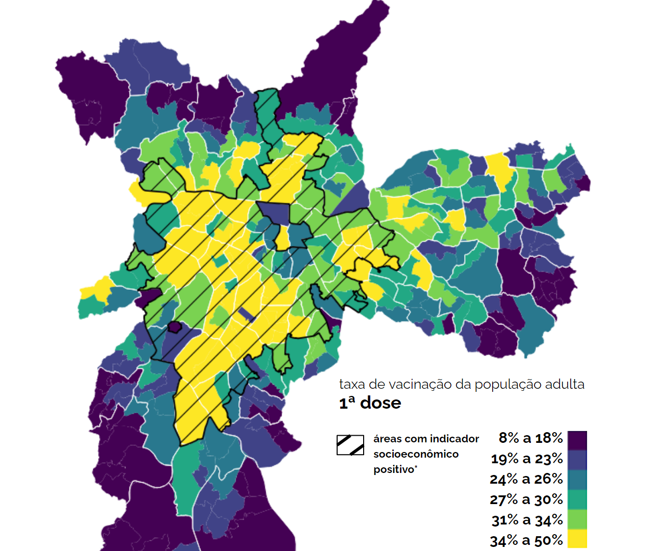 O mapa acima mostra a distribuição da primeira dose contra Covid-19. A classificação indicada por cores diz respeito à taxa de imunização, calculada sobre a população adulta (com 18 anos ou mais). A hachura preta marca as áreas em que o GeoSES, [1] índice socioeconômico para estudos em saúde, é positivo. Trata-se de um índice composto que incorpora as dimensões de educação, pobreza, riqueza, renda, segregação, mobilidade, privação de recursos e serviços, e seu valor varia de -1 (piores condições gerais de vida) a +1 (melhores condições gerais de vida). As áreas da cidade com as piores condições são também aquelas onde a cobertura vacinal é menor. Uma constatação que contraria frontalmente o princípio da equidade, tão importante para o SUS, assim como o direito à saúde e à vida.