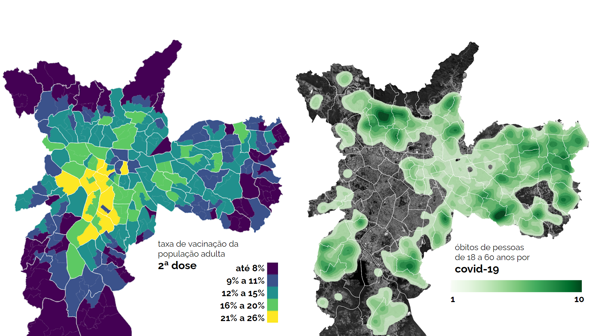 Mapa com a taxa de vacinação em 2ª dose [esq.] calculada a partir da estimativa da  população adulta para 2021 e mapa de calor dos óbitos por Covid-19 [dir.] da população adulta (18 a 60 anos) entre março de 2020 e março de 2021. (fontes: SIM/SIVEPGripe/SMS-SP e SI-PNI/Open DataSUS)