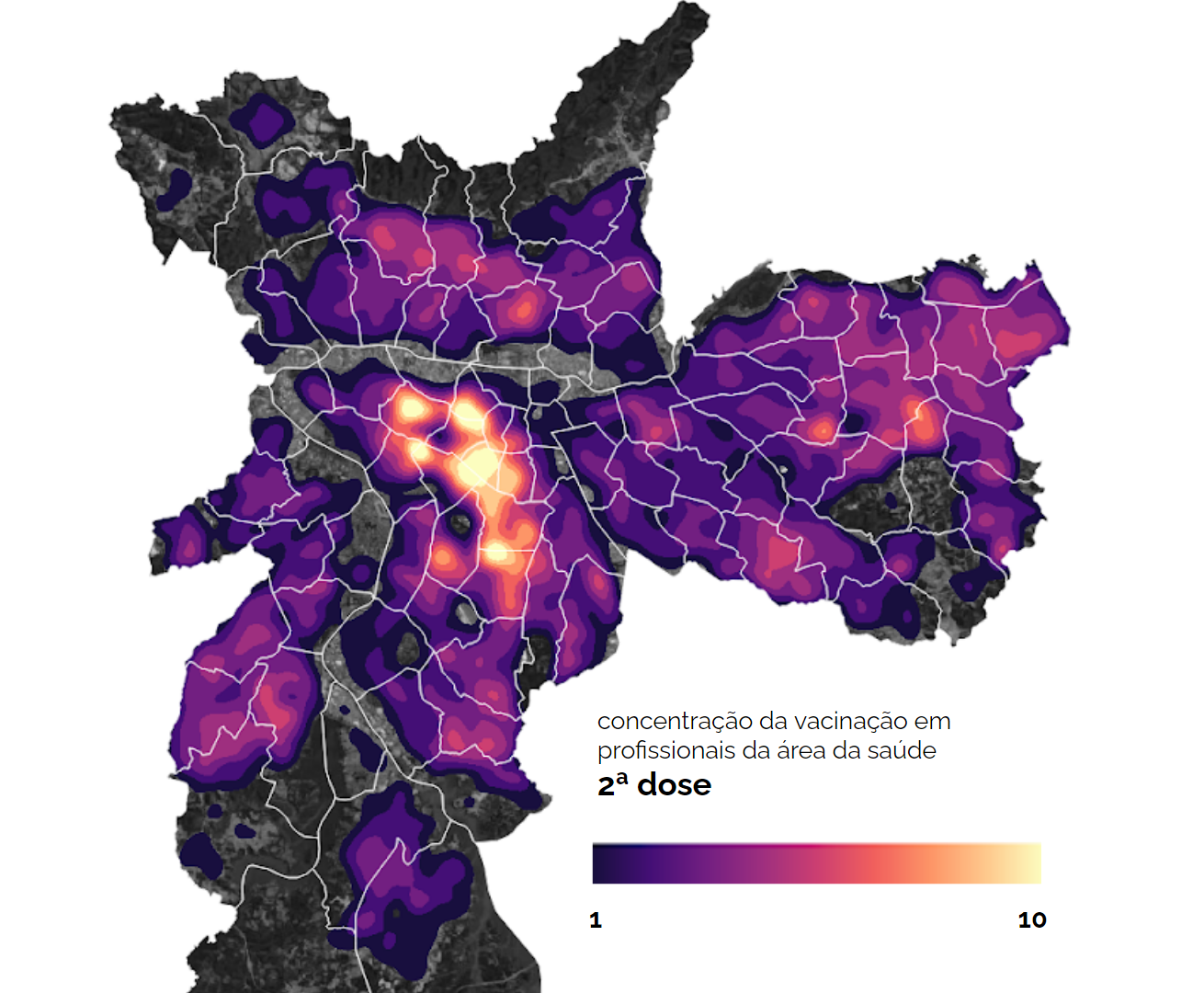 A correlação entre cobertura vacinal e índice socioeconômico é alta e confirma como o atual processo de imunização reforça as desigualdades colocadas no território da cidade. Exemplificando: uma das áreas do distrito de Pinheiros apresenta GeoSES de +0,710 e uma cobertura vacinal de 50,1% da primeira dose e 26,0% da segunda dose. No outro extremo, uma das áreas do distrito Vila Andrade tem a mais baixa cobertura vacinal, com 8,1% da população acima de 18 anos em 1a dose, e 2,4% em 2a dose. Esta área, com 66.300 habitantes, corresponde à favela Paraisópolis, que tem o GeoSES de -0,559. Outro exemplo é uma das áreas do distrito Jd. Ângela tem o GeoSES de -1. Esta área em específico tem a segunda menor cobertura vacinal na cidade, com 8,5% e 3,1% nas 1a e 2a doses respectivamente.