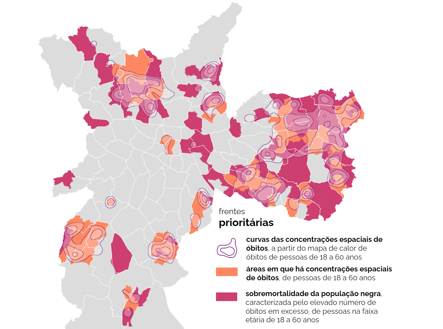 Mapa das frentes prioritárias para distribuição dos imunizantes, considerando os critérios de concentrações espaciais de óbitos de pessoas de 18 a 60 anos e áreas com sobremortalidade da população negra. (fonte: SIM/SMS-SP e F. Seade, 2021)