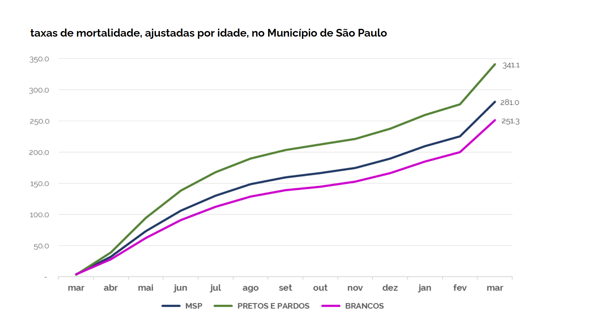 Gráfico das taxas de mortalidade, ajustadas por idade, no Município de São Paulo, considerando óbitos de março de 2020 a março de 2021. (fonte: SIM/SMS-SP; F. Seade, 2021 e Censo, 2010).