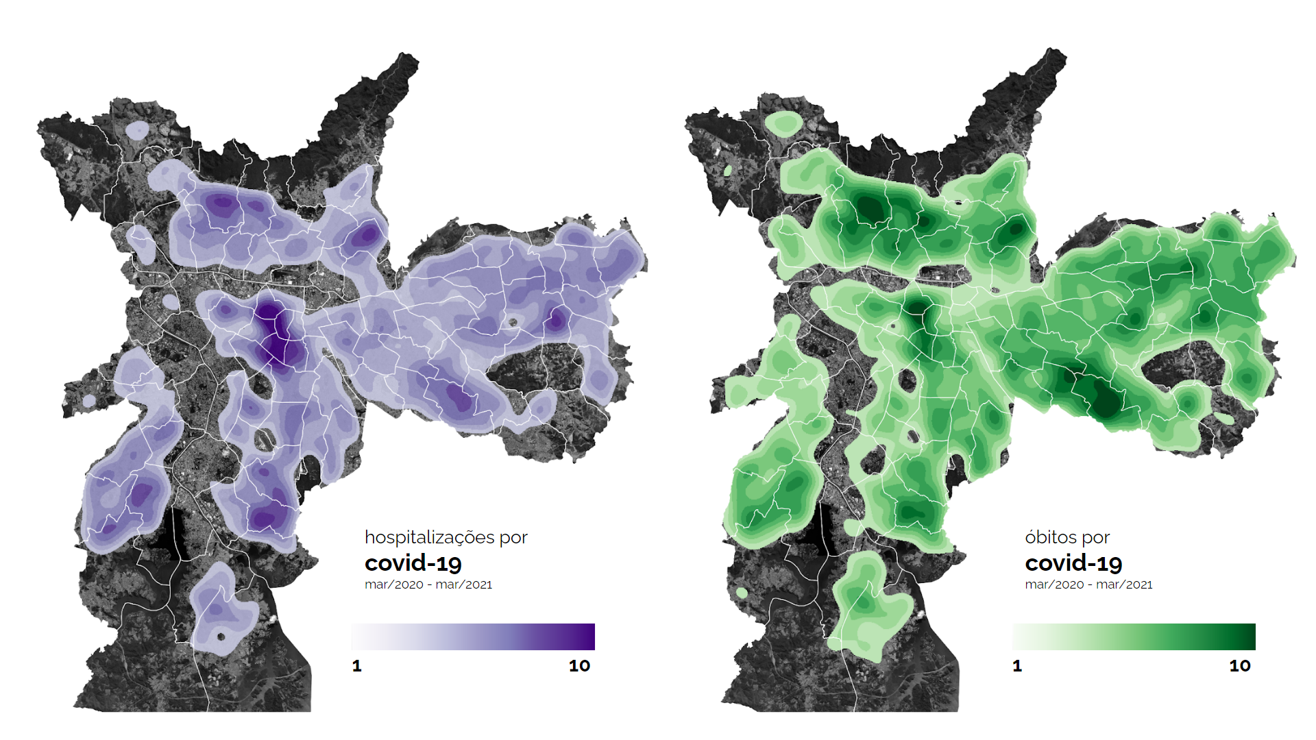 As análises territoriais da pandemia de coronavírus no Município de São Paulo (MSP) oferecem leituras sobre quais áreas da cidade registram as maiores taxas de óbitos e hospitalizações por Covid-19 de pessoas com menos de 60 anos. Os mapas a seguir mostram onde foram observadas as maiores concentrações de hospitalizações e de óbitos por Covid-19 na cidade, no período compreendido entre março de 2020 e março de 2021.