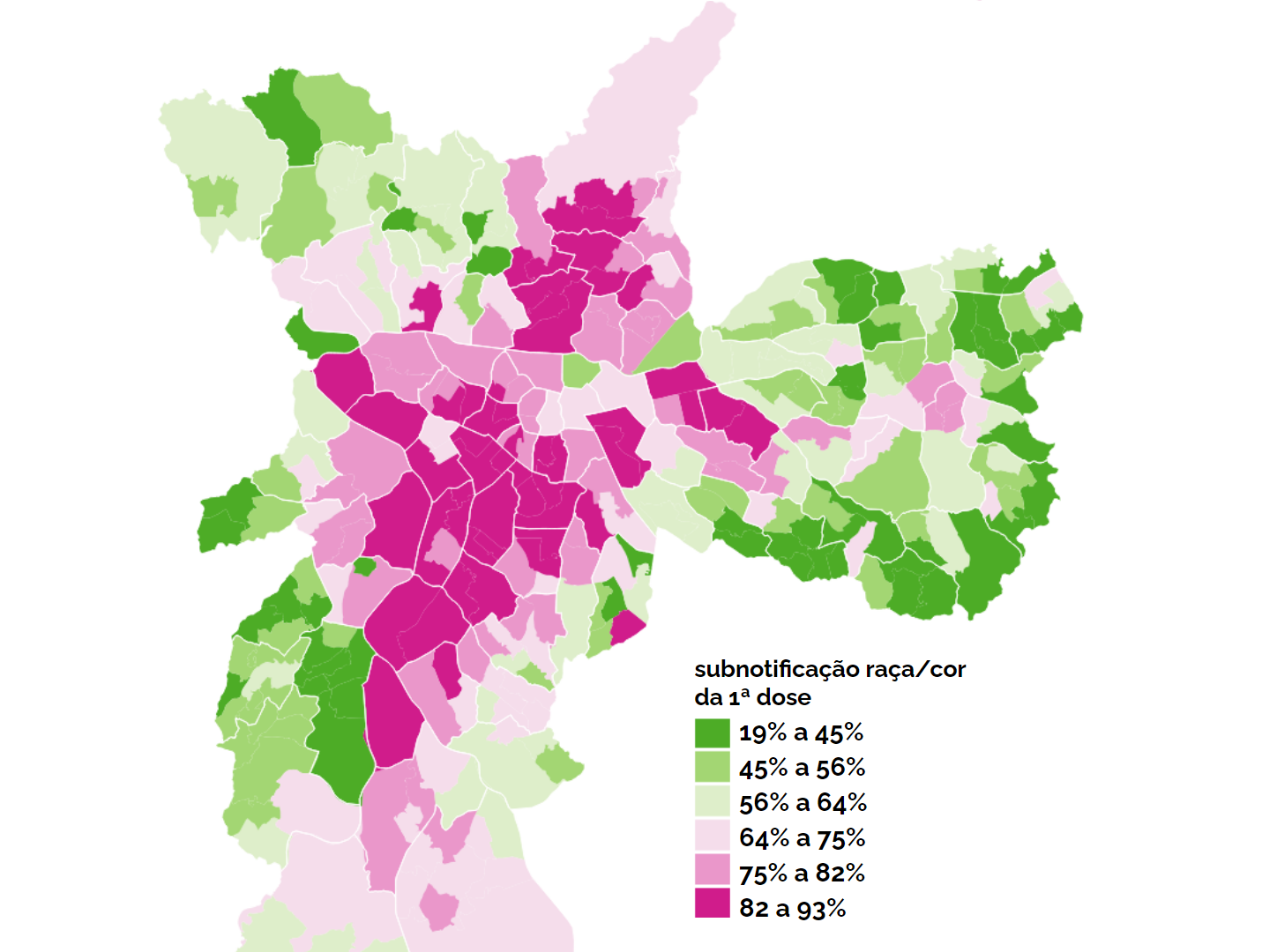 Este padrão de preenchimento (e de omissão da informação) pode ser entendido como sintoma do racismo estrutural dentro do sistema de saúde e do modo com que se opera a produção de dados. O fenômeno da não racialização da população branca tem como consequência esse tipo de subnotificação demonstrado pelo mapa, em que apenas pessoas negras, indígenas e amarelas têm sua raça reconhecida e anotada. É como se, neste padrão de preenchimento de informações, pessoas brancas não tivessem raça e a notificação deste campo só fosse necessária quando a pessoa vacinada é preta ou parda. Não é possível afirmar que todas as doses sem informação de raça/cor tenham sido aplicadas em pessoas brancas, mas o mapa sugere que a maioria daqueles 61% não notificados deve ser composta pela população branca dado a distribuição espacial das diferentes raças na cidade de S. Paulo.