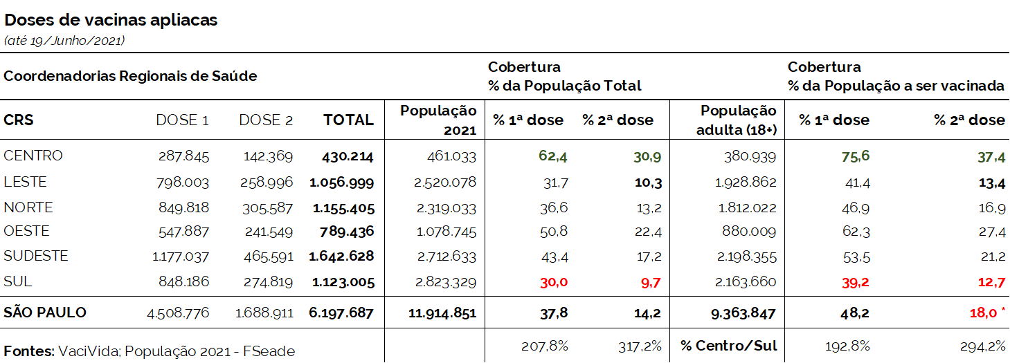Enquanto a cobertura média das pessoas vacinadas com duas doses, que é o que importa para conferir a esperada proteção contra o coronavírus, é de 18,0% da população acima de 18 anos de idade, observa-se uma importante disparidade entre as seis Coordenadorias de Saúde da capital: três delas estão com cobertura acima da média da cidade (Centro, Oeste e Sudeste), com o Centro apresentando mais do dobro da cobertura média, vemos três Coordenadorias abaixo da média da cidade, com destaque para as Coordenadorias Sul e Leste, sendo justamente as áreas com menor renda, maior concentração de pessoas negras e maior número de óbitos por Covid-19. Um dado importante é que no Centro, 75% das pessoas com mais de 18 anos já teriam recebido pelo menos uma dose, e METADE já tomou a segunda dose – enquanto nas Coordenadorias Leste e Sul, menos de um terço dos vacinados com a 1ª Dose foram corretamente vacinadas com duas doses. [3]