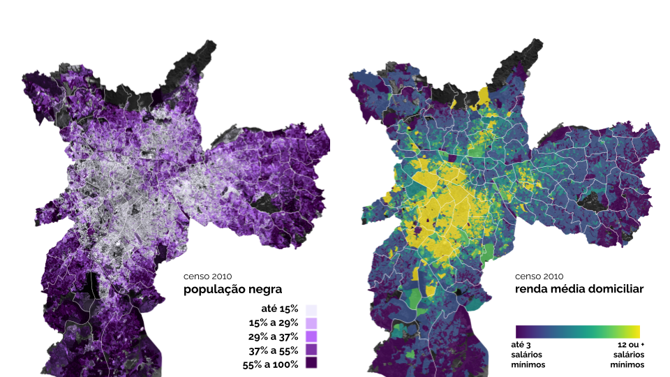 Mapa do percentual de população negra (preta e parda), por setor censitário [esq.] e mapa da renda média domiciliar [dir.] . (fontes: IBGE, Censo 2010)
