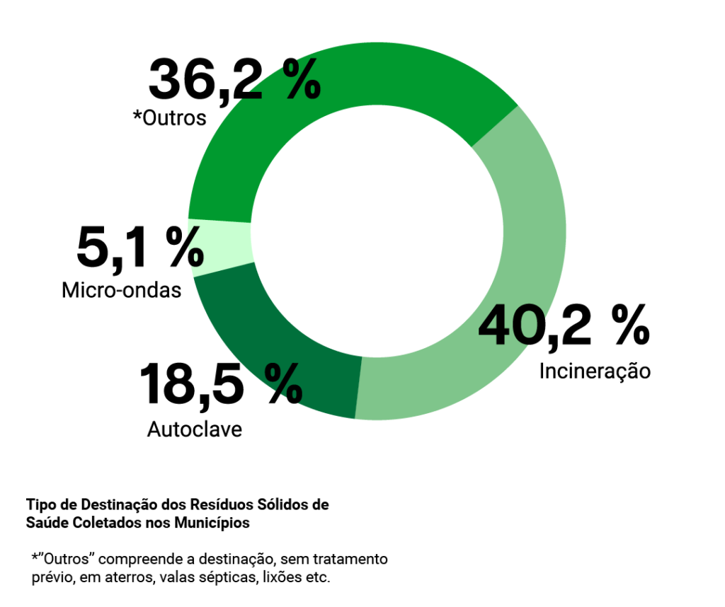 Chama atenção essa colocação sobre o “lixo hospitalar”, como se não houvesse sistema de tratamento operando no país. De fato tem-se diversas formas de tratamento dos resíduos sólidos de saúde sendo implementadas nos municípios e estados brasileiros, conforme vemos no gráfico abaixo (Panorama dos Resíduos Sólidos no Brasil (IBGE/Abrelpe, 2018-2019).
