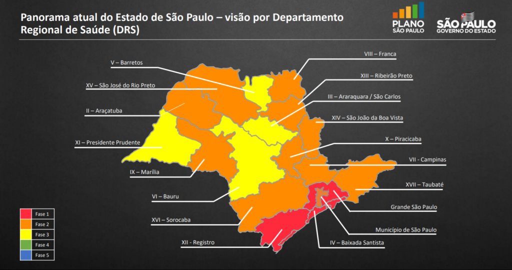 Nessa semana, mesmo assistindo ao aumento do contágio pelo novo coronavírus, o Governo do Estado de São Paulo iniciou um plano de retomada das atividades econômicas e serviços não essenciais. O Plano São Paulo prevê essa retomada em cinco fases de forma gradual, sendo a fase 1 com mais restrições e a fase 5 com mais atividades liberadas.