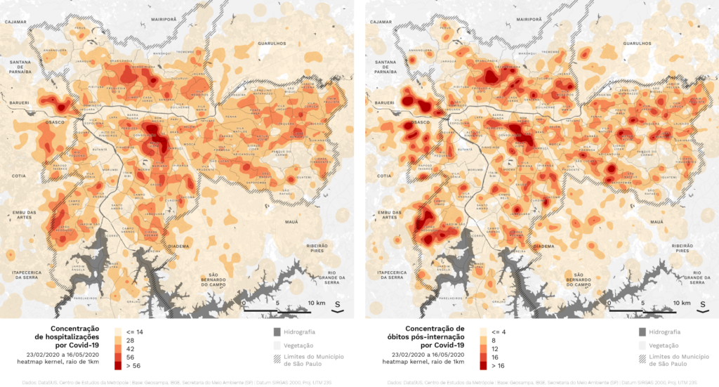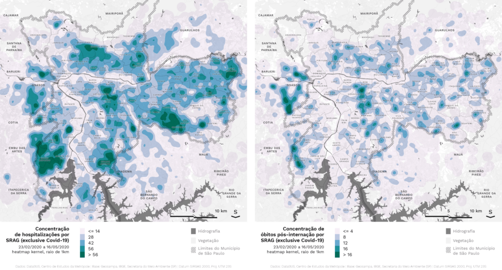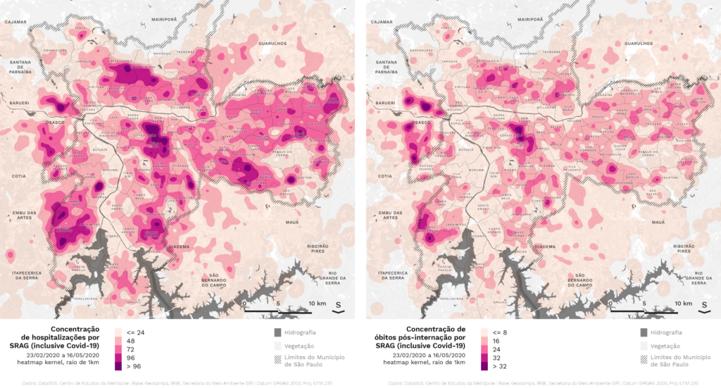 Os mapas abaixo possibilitam análises mais precisas da difusão espacial da pandemia do que os mapas oficiais, que utilizam a escala dos distritos ou das cidades. Isso foi possível a partir da identificação do CEP de residência das pessoas que foram hospitalizadas com Síndrome Respiratória Aguda Grave (SRAG), entre elas a COVID-19.