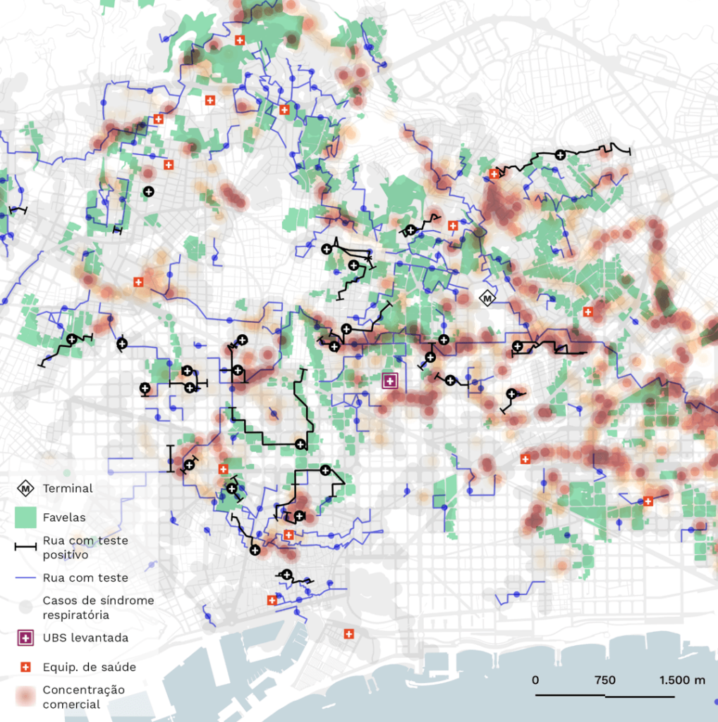 Evidente que os mapas disponibilizados aqui não representam a totalidade de casos e óbitos, somente aqueles que foram hospitalizados (DATASUS) ou atendidos pela unidade de saúde mapeada. Além disso existem várias lacunas que precisam ser consideradas: uma parcela considerável dos dados não está representada no mapa, pois não constava a informação relativa ao CEP; os dados são oriundos das fichas médicas, preenchidas pelos profissionais que atuam na linha de frente dos hospitais, que sob forte pressão podem cometer equívocos ou até mesmo omitir informações durante o preenchimento. Ainda assim, eles sinalizam fortemente a necessidade de considerar a heterogeneidade dos territórios para entender – no caso específico de cada cidade – as formas através das quais a epidemia tem se difundido espacialmente e assim traçar estratégias seguras e enraizadas de prevenção e atendimento à saúde.